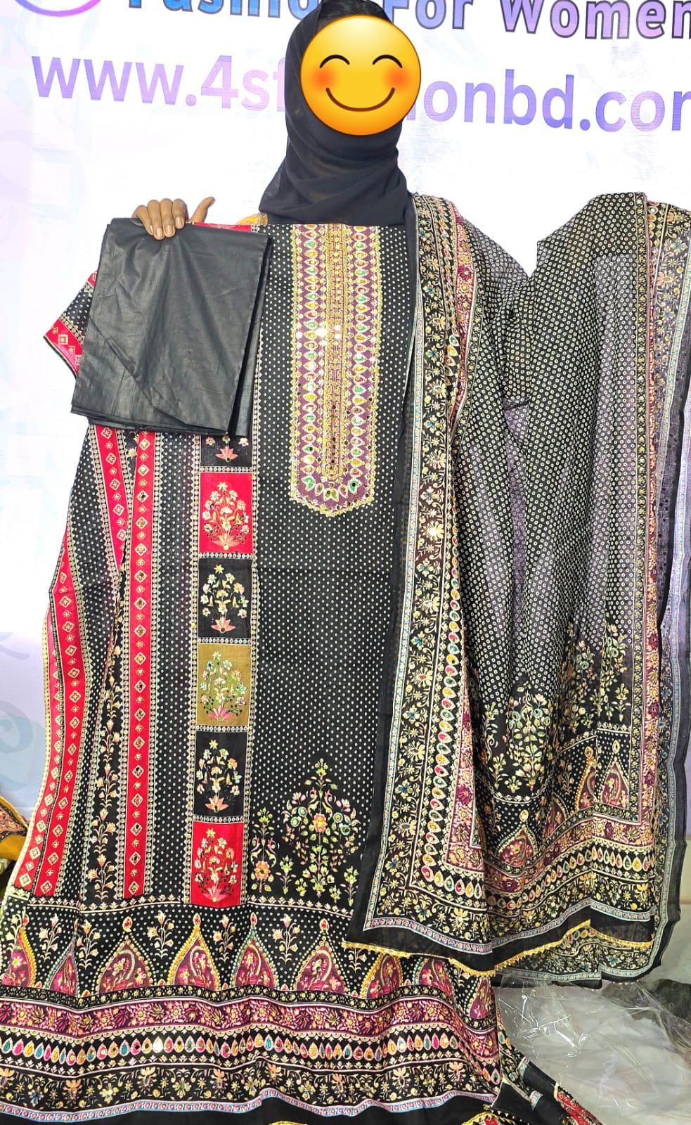 যারা একটু কালারফুল পোশাক পছন্দ করেন, তাদের জন্য সেরা চয়েস। ইউনিক জ্যামিতিক এবং ফ্লোরাল ডিজাইনের এই স্যুটটিতে পাবেন নিখুঁত নেকলাইন এমব্রয়ডারি।